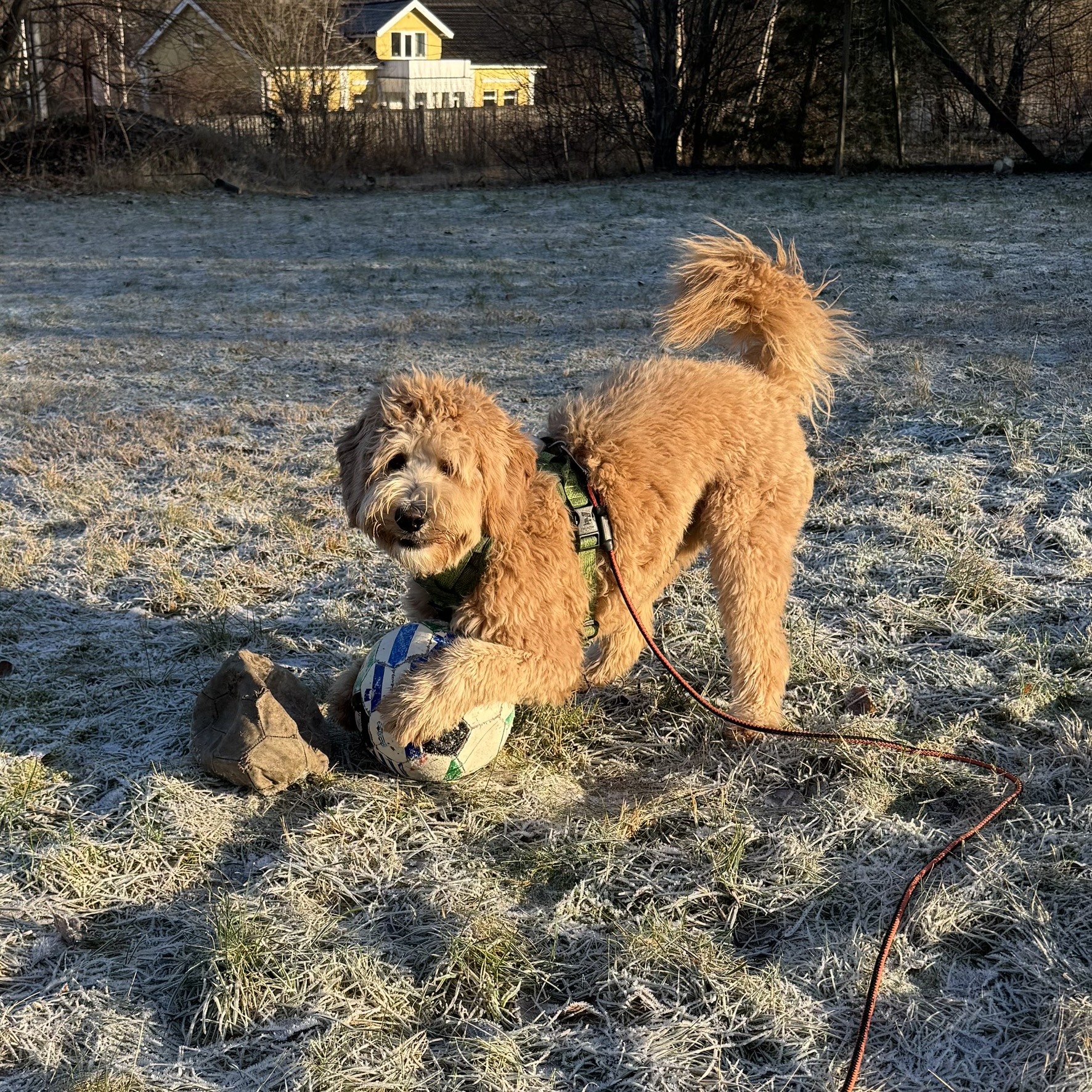 Jag behövde hitta en hund som skulle ha just de egenskaperna jag sökte efter: nyfiken, social, glad, vänlig, trygg och kontaktsökande hund i lagom storlek som dessutom har en kropp som är hälsosam och hållbar. Jag hittade till Cajsa Stålhammar på Humlamadens Labradoodle och efter ett ”öppet hus” där, hösten 2015, så insåg jag att jag hittat det jag sökte i just Labradoodle.